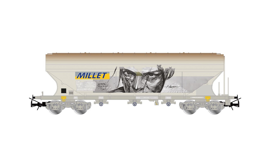 Jouef HJ6319 Gabonaszállító négytengelyes teherkocsi, graffitivel, Millet, SNCF (E5) (H0)