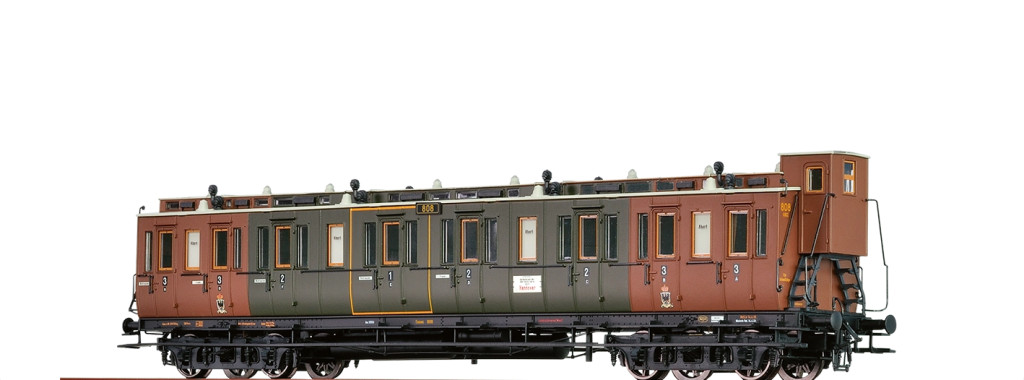 Brawa 45268 Oldalfellépős személykocsi fékházzal, négytengelyes ABC4, 1./2./3. osztály, K.P.E.V. (E1) (H0)