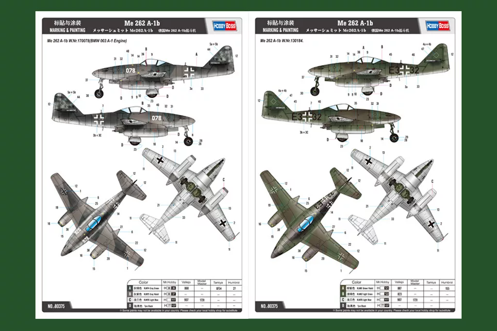 HobbyBoss 80375 Messerschmitt Me-262 A-1b repülőgép makett (1/48)