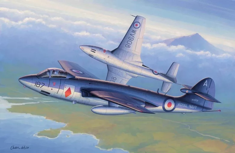 A Hawker Sea Hawk egy brit egyhajtóműves, egyhajtóműves fedélzeti sugárhajtású vadászrepülőgép, teljesen fém konstrukcióval. A prototípus (P.1040 jelzéssel) repülése 1947-ben történt, és a gép 1953 márciusában állt szolgálatba. 1983-ig ott maradt, és ebben az időszakban az FAA fő "igáslova” lett. A gép nagyon sikeres konstrukciónak bizonyult, Rolls-Royce Nene 103-as motorral hajtotta a Hawker Se Hawk-ot Hollandiába, Németországba és Indiába exportálták, de fő felhasználója a brit FAA volt. Ennek a repülőgépnek több változata készült, melyek közül a legfontosabbak: F.1 (vadász változat), FB.3 (vadászbombázó változat) és FGA.6 az új Rolls-Royce Nene Mk 103 motorral. Műszaki adatok: hossz: 12,09 m, szárnyfesztávolság: 11,89 m, magasság: 2,64 m, maximális sebesség: 965 km/h, emelkedési sebesség: 29 m/s, maximális hatótáv: 770 km, maximális magasság: 13500 m, fegyverzet: fix - 4 db Hispano Mk.V ágyú, kaliber 20 mm Felfüggesztett - 908 kg bombák vagy rakétákig.