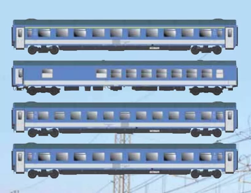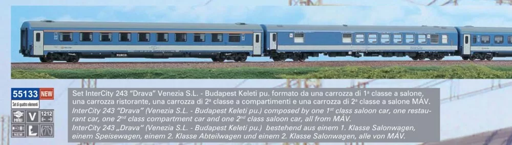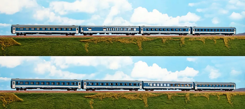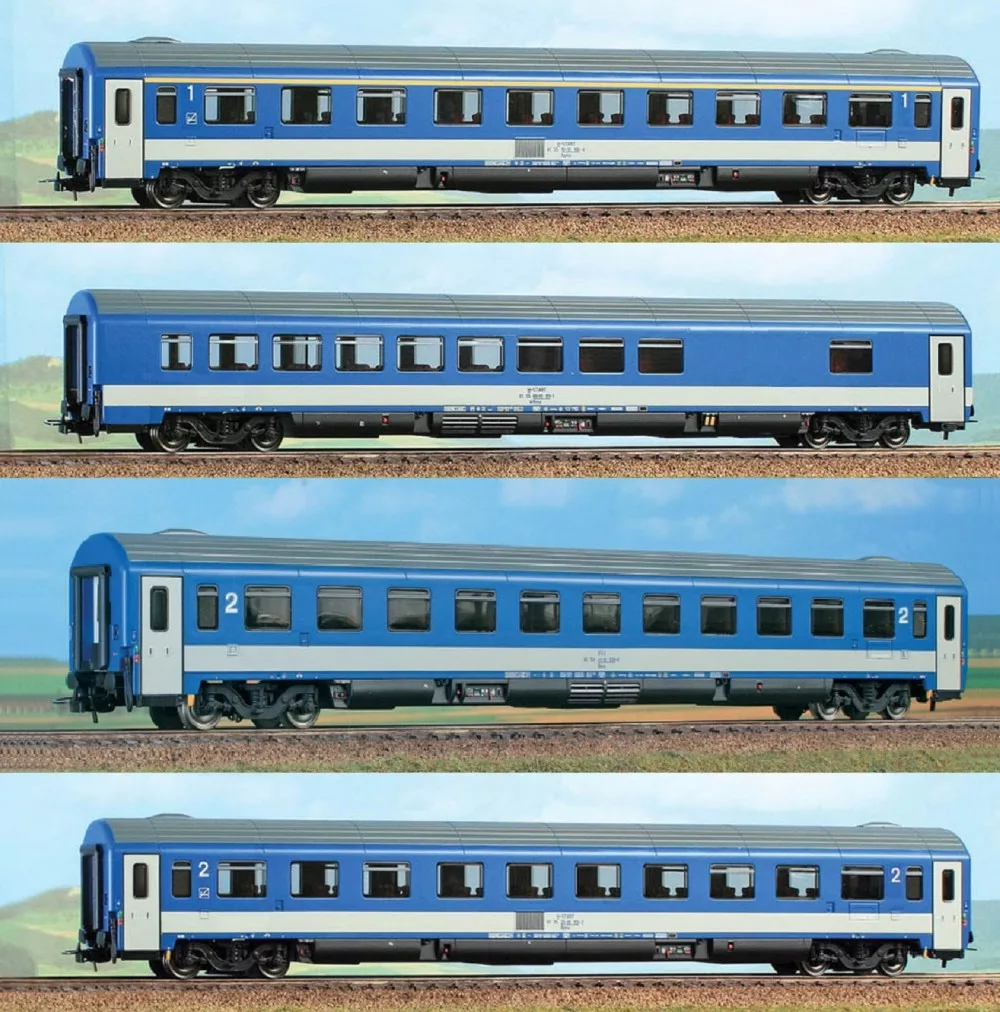 H0 méretarányú modellvasút nyomtávolsága 16,5 mm.Készlet tartalma: egy bautzeni étkező (WRm), egy 1.o. termes (Apmz), egy 2.o. fülkés (Bmz) és egy 2.o. termes (Bpmz) személykocsi
